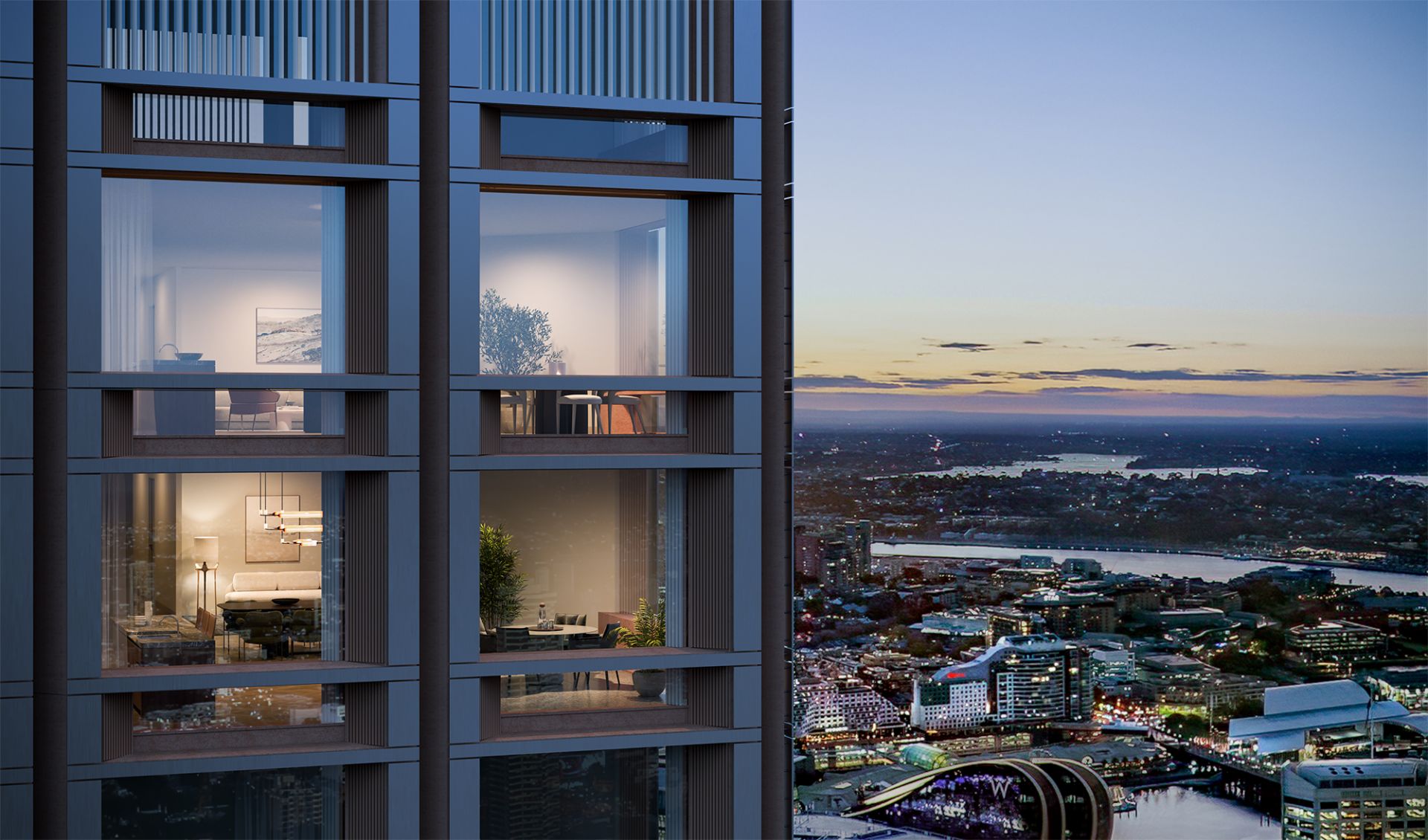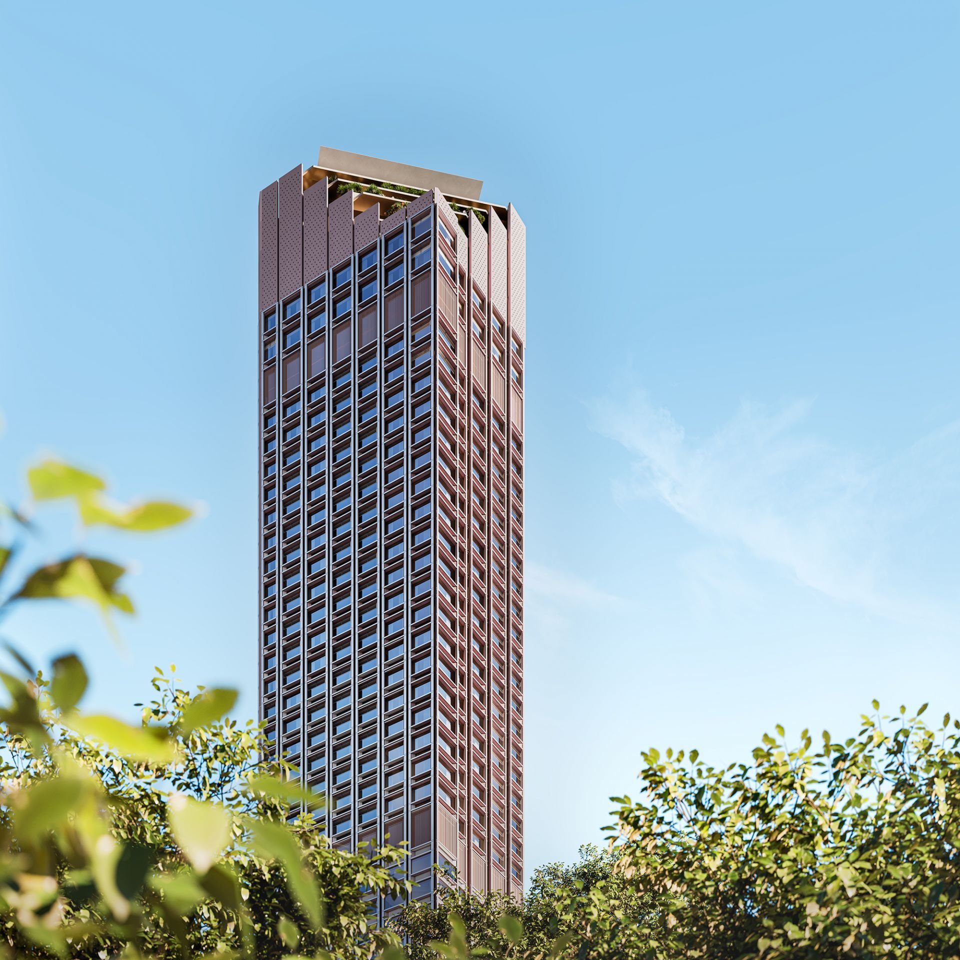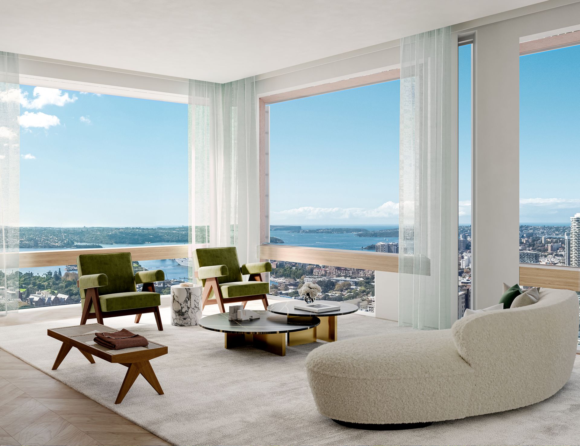 The upper-level residences feature spacious, light-filled interiors with exquisite finishes. From the sophisticated chevron-patterned timber floors to the marble-clad bathrooms, each residence embodies luxury and attention to detail. The floor-to-ceiling windows and operable wintergardens seamlessly connect the interiors with the expansive cityscape, offering residents a perfect balance of serene indoor living and vibrant urban surroundings.