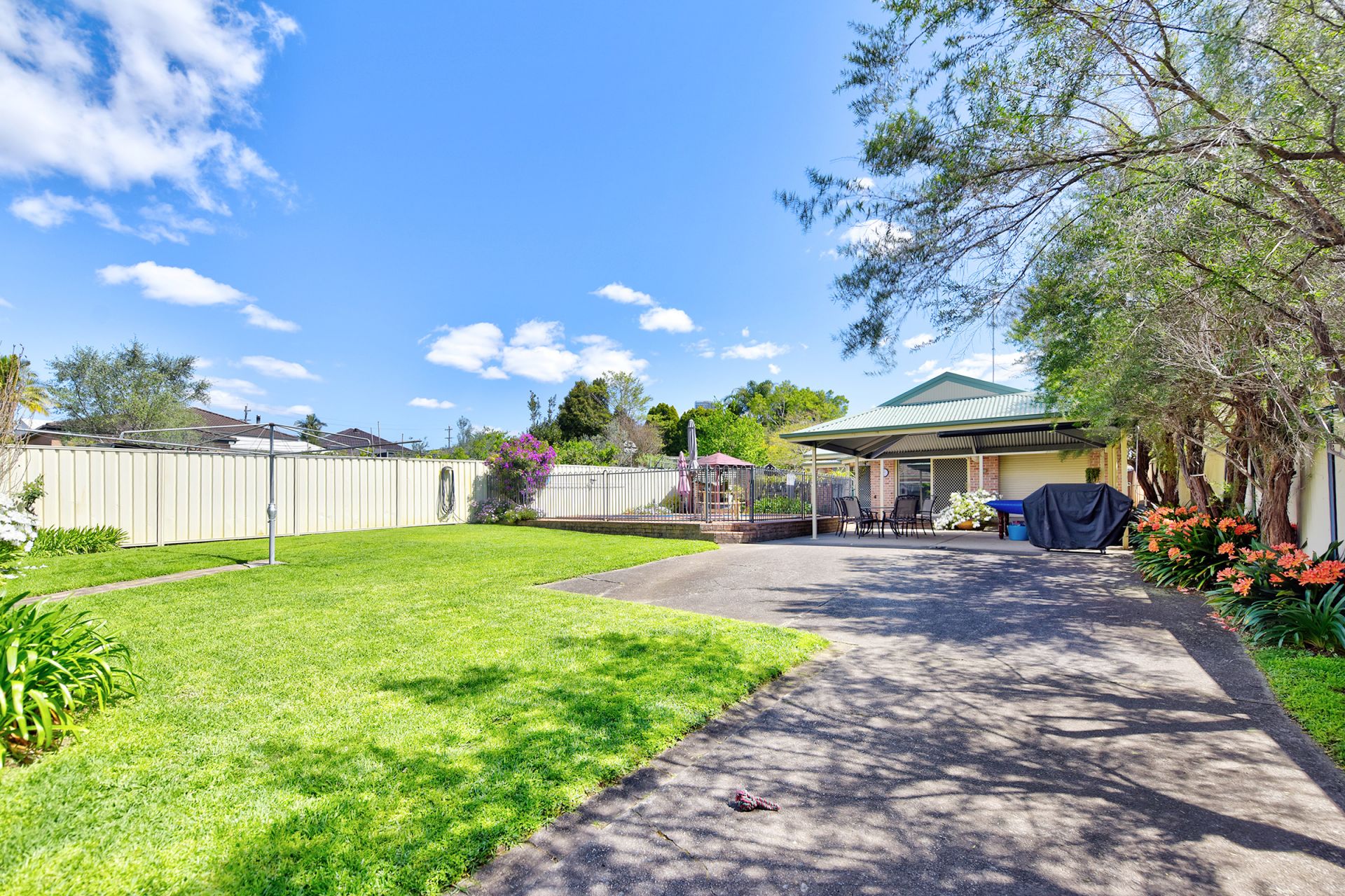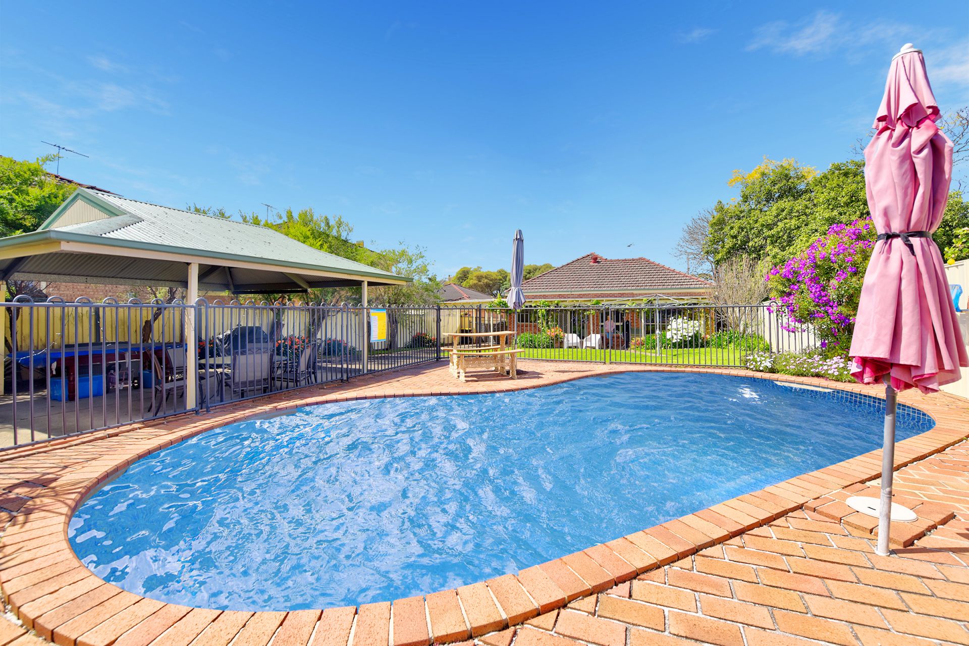 - Expansive backyard with sparkling swimming pool and large pergola, ideal for year-round entertaining.
