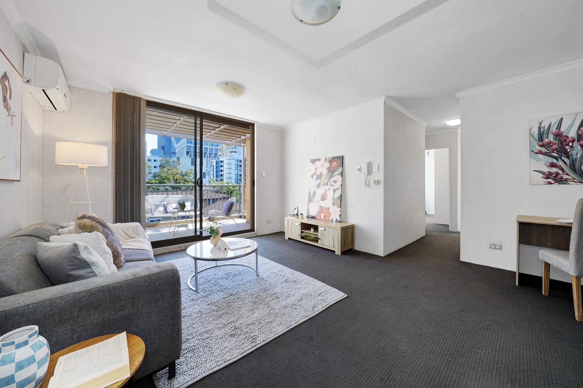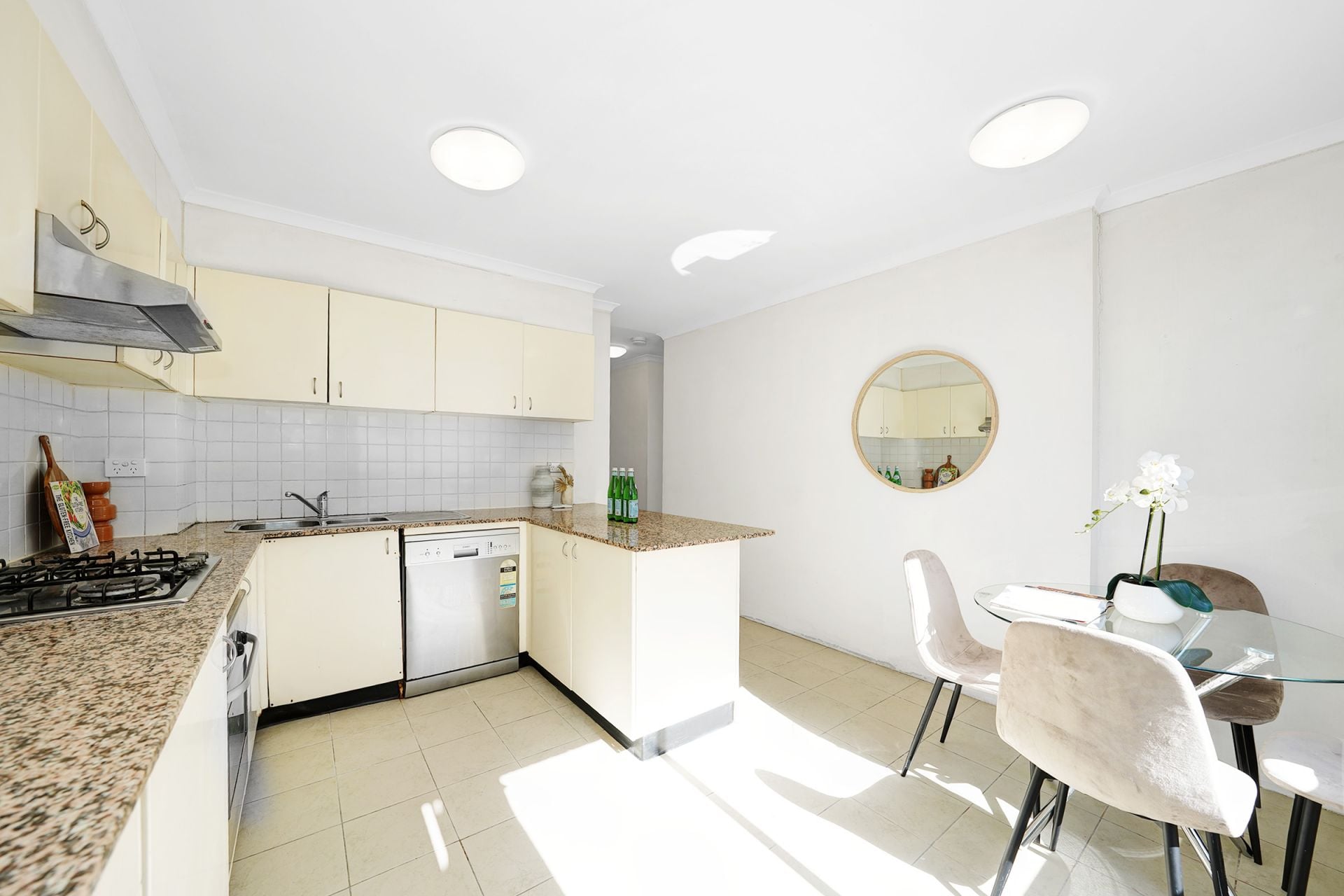 The well-appointed kitchen features gas cooking and ample storage, while the expansive lounge area opens to a private balcony, creating an ideal indoor-outdoor living environment. Both bedrooms are generously sized and include built-in wardrobes.